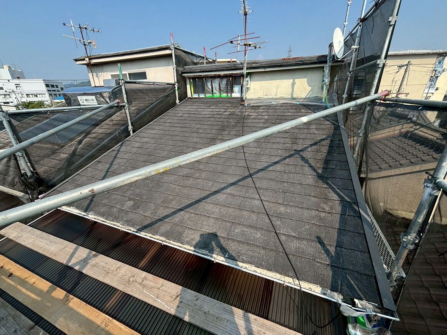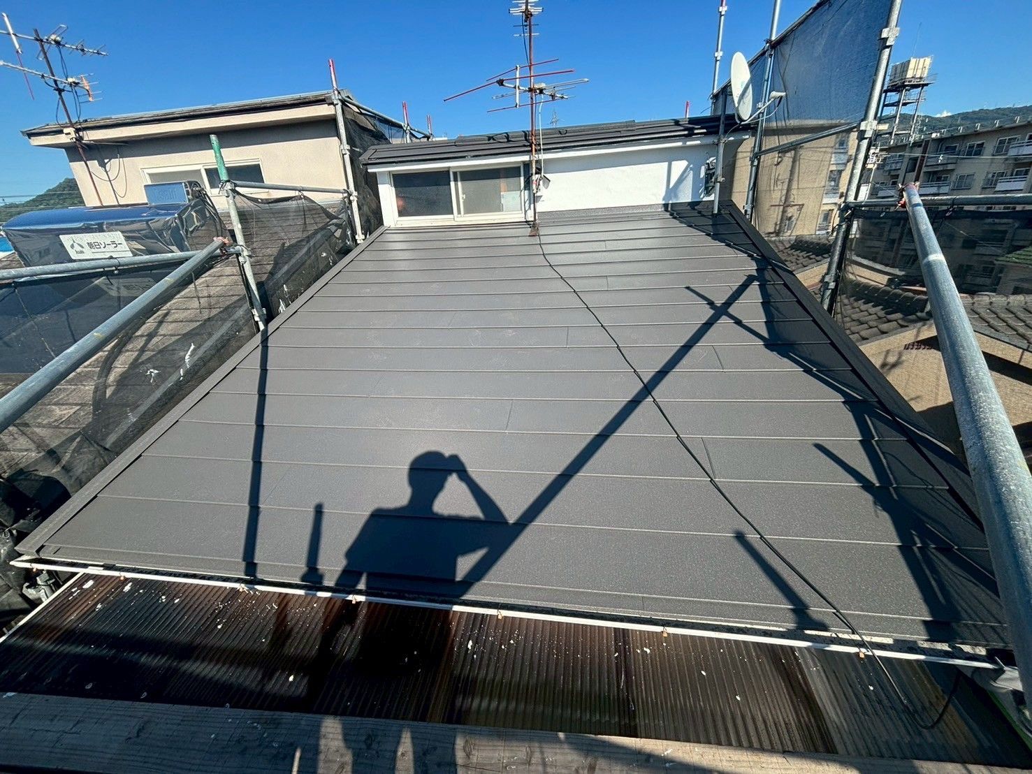 夏場の暑さを軽減したいと言う要望を叶える為、屋根は断熱材付きのスーパーガルテクトでカバー工事を行い、換気棟を設置しております。
