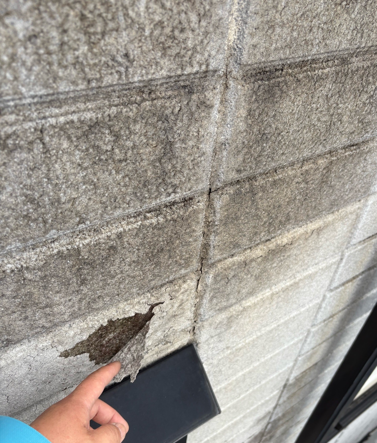 一度外壁塗装を施工済みの物件で、以前は訪問販売の業者に石調の吹付塗装で仕上げが行われておりました。