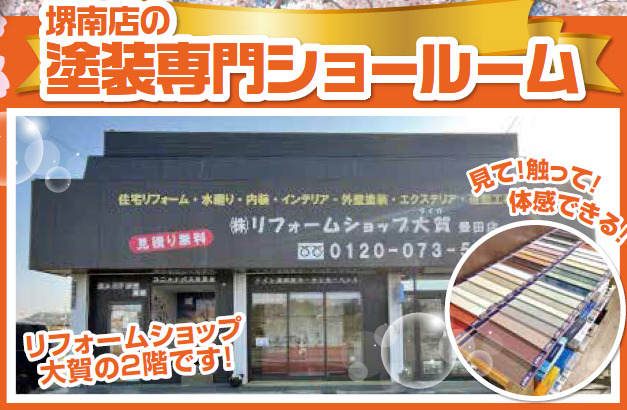 また、堺南店では塗装専門ショールームもご用意しており、「塗料の種類」「色見本」「外壁材サンプル」などを実際に見て・触れて・体感していただくことができます。
