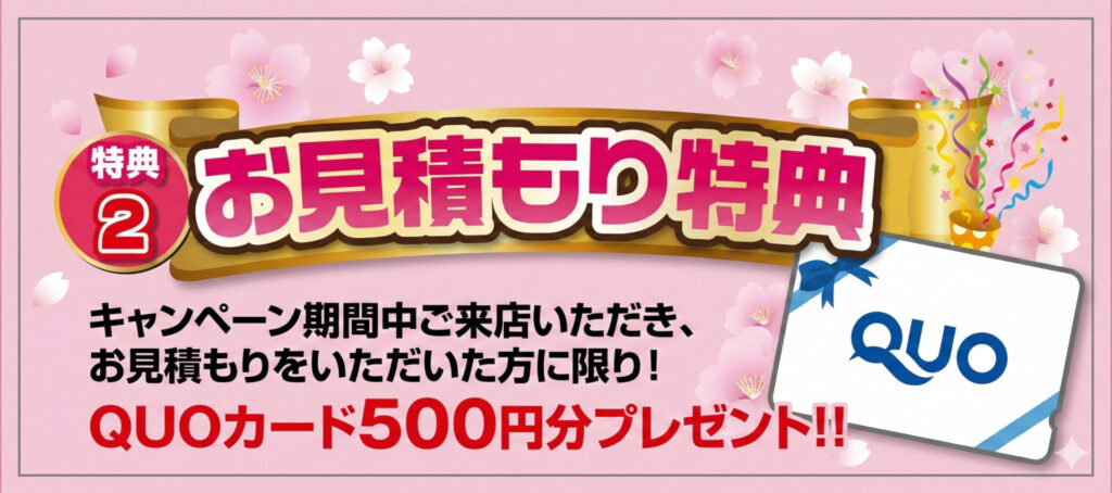 キャンペーン期間中に「ショールームにご来店」「お見積もり」をご依頼いただいたお客様には、QUOカード500円分をプレゼントいたします。
