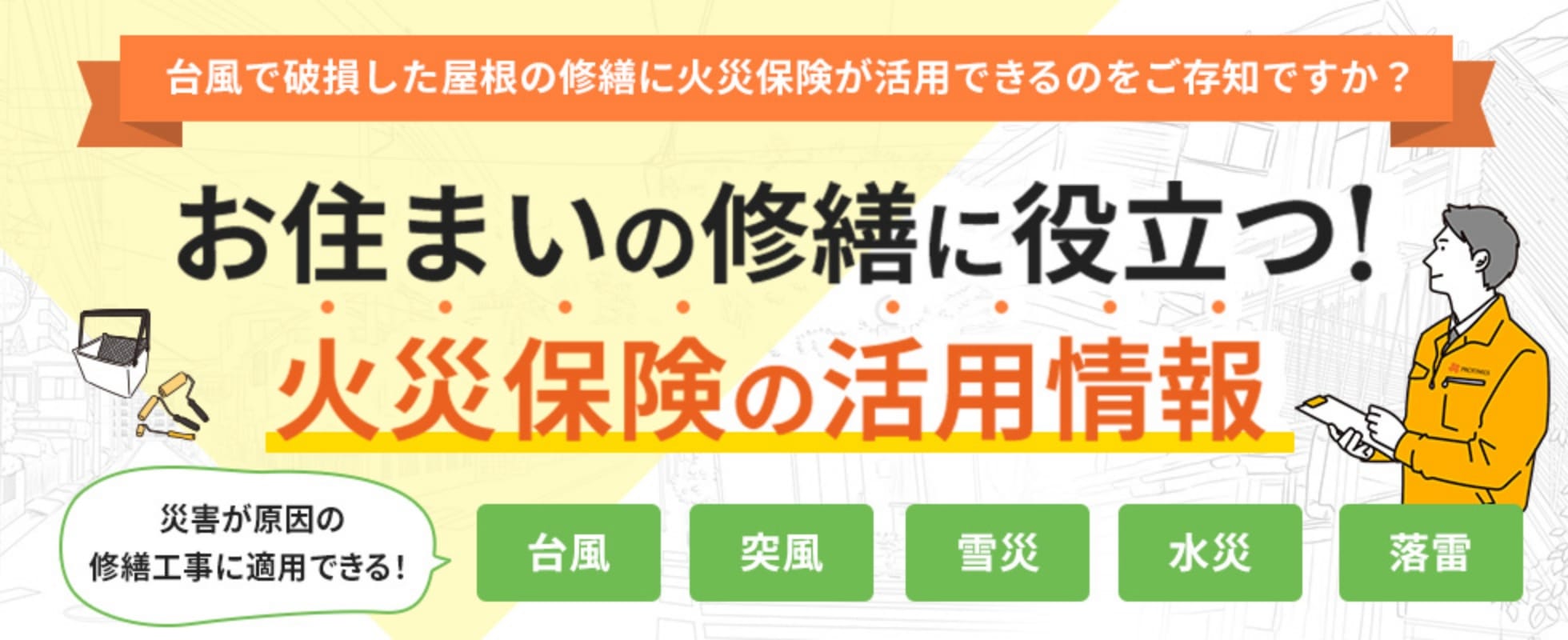 火災保険は自然災害によって破損した屋根や外壁などを修繕する際に活用できます。もっとも身近な災害として台風があげられます。火災保険には風災被害による基本補償が一般的に含まれているので、台風によって破損した場合にも補償をうけられる可能性があります。