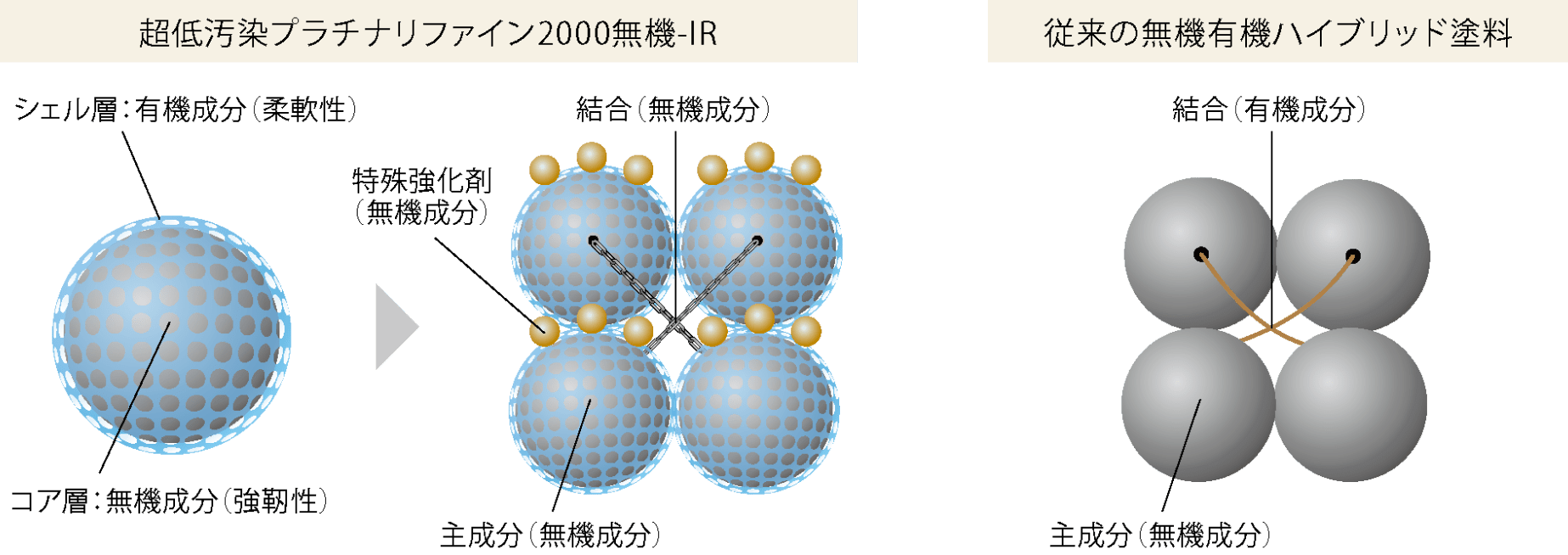 一般的な無機有機ハイブリッド塗料は強靭性と柔軟性を両立するために、無機成分を有機で結合しています。しかし、この有機の結合部分が紫外線などにより劣化するという課題がありました。超低汚染プラチナリファイン2000無機 -IR は、主成分に無機成分・有機成分の2層で構成される樹脂を採用し、結合部分にも無機成分を使用しています。さらに、主成分の樹脂に無機成分を固着させる「トリプル無機複合技術」により、従来の無機有機ハイブリッド塗料を凌ぐ「超耐候性」を実現しました。