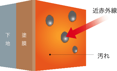 親水性 (水になじみやすい性質)により、塗膜に汚れが付着しても、汚れの間に水が入り込み、汚れを洗い流す。